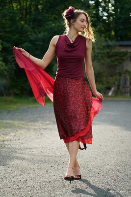 unter diesem Namen fertige ich in sorgfältiger Handarbeit romantische Tangokleidung aus hochwertigen, größtenteils natürlichen Stoffen. Dabei ist mir der kreative Teil meiner Arbeit besonders wichtig. Auswahl und Kombination von Stoffen, Farben und Mustern, die ich in Harmonie mit einfallsreichen Schnitten zu Kleidungsstücken verarbeite, die den Tanz in seinen fließenden Bewegungen anmutig begleiten.